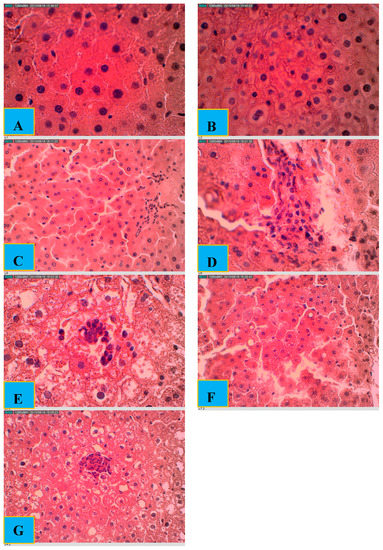 The extent of lipid peroxidation in the liver homogenate was determined spectrophotometrically by measuring the formation of malondialdehyde (MDA) according to the method described by Varshney and Kale [43], and this was expressed in terms of malondialdehyde (MDA) levels, which is the end product of the reaction. Serum activity of ALT, AST and the concentrations of total protein were measured by using commercial kits (Randox Laboratories Ltd., Crumlin, UK) specific for each test; the concentrations of the serum interleukin-6 (IL-6) was estimated using the enzyme-linked immunosorbent assay kit (Thermo Scientific, Waltham, MA, USA) while the hepatic level of total glutathione (Total GSH) as well as the activities glutathione-S-transferases (GST), superoxide dismutase (SOD) and catalase (CAT), were determined by using the corresponding assay kits (ScienCell Research Laboratories) according to the manufacturer’s instructions.