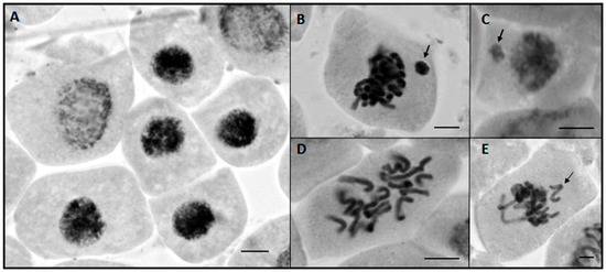In addition to these aneugenic alterations, the occurrence of metaphases with sticky chromosomes (Figure 1C) is also attributed to the mechanism of aneugenic action, since one of the factors responsible for their formation is related to proteins of the chromosomal protein scaffold [35]. The consequence of sticky chromosomes is abnormal chromosome segregation, which may compromise the balancing of their number in the daughter nuclei and may lead to cell death in more severe cases when the interchromatid bond [35] is very intense [33].