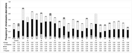 Distribution of the frequency of bridge, c-metaphase, stick, loss and polyploid observed in meristematic cells of Lactuca sativa using three different concentrations (50, 100 and 250 µg mL−1) of the triazoles 4a–4h.