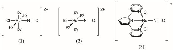 - Da Silva, S.C.; Franco, D.W. Metastable Excited State and Electronic Structure of [Ru(NH3)5NO]3+ and [Ru(NH3)4(OH)NO]2+. Spectrochim. Acta A 1999, 55, 1515–1525. [Google Scholar] [CrossRef]