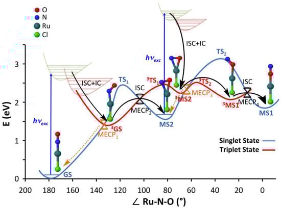 Figure 2 summarizes the mechanistic picture that was derived from a previous DFT study of complex (1) [41]. Upon blue light irradiation, the most stable N-bonded ground-state isomer GS, in which the Cl, Ru, N, and O atoms are collinear, is promoted to excited singlet metal-to-ligand charge transfer (1MLCT) states. These states are known to quickly relax by intersystem crossing (ISC) due to significant spin-orbit coupling (SOC) and by internal conversion (IC) to lower triplet MLCT excited states (3MLCT) [67,68]. Assuming that the lowest 3MLCT is mainly populated, the system then relaxes to a N-bonded triplet state (denoted 3GS) in which the Ru–N–O is bent. A large barrier (ca. 1 eV) on the adiabatic triplet PES forbids the system to reach a sideways NO-bonded intermediate (denoted 3MS2). However, a more accessible route is provided by ISC at a triplet/singlet crossing point, allowing the system to decay at a sideways NO-bonded intermediate on the singlet state (denoted MS2) [67]. A key feature of this mechanism is that the MS2 metastable state can also absorb the same blue light photon as GS, as revealed by the computed electronic absorption spectra at the TD-DFT level [41,42]. This second photon absorption at MS2 triggers electronic transitions to 1MLCT states from which non-radiative decays by ISC and IC lead most probably to the population of 3MS2. From this intermediate, only a small adiabatic barrier needs to be overcome on the lowest triplet PES to reach a O-bonded triplet intermediate (denoted 3MS1), in which the Ru–O–N is bent. Another triplet/singlet crossing lying nearby allows for ISC to the O-bonded MS1 product [67], restoring the collinear conformation of the Cl, Ru, O, and N atoms. This final photoproduct does not absorb in the blue light spectral range, allowing for very high photoconversion yield.