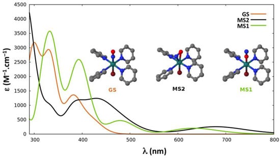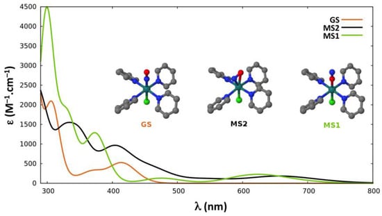 In the proposed sequential two-photon photoisomerization mechanism described in Section 2.1, the absorption properties of GS, MS2, and MS1 are all of crucial importance. Thus, we report here the TD-DFT absorption spectra computed for each isomer of the three complexes. Figure 3, Figure 4 and Figure 5 display the spectra of GS, MS2, and MS1 for complexes (1), (2) and (3), respectively. Further details about the transition wavelengths and oscillators strengths are given in Supporting Information.