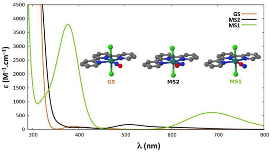 While a single crystal of trans-[RuCl(NO)(py)4](PF6)2·1/2H2O presents a quasi-complete photoconversion yield between the stable N-bonded nitrosyl (denoted GS) and metastable O-bonded isonitrosyl (denoted MS1) isomers under continuous irradiation in the 473–476 nm region [51,52,53], much lower efficiencies were observed for trans-[RuBr(NO)(py)4](PF6)2 and trans-(Cl,Cl)[RuCl2(NO)(tpy)](PF6) (where tpy denotes a terpyridine ligand) with yields of 46% and 8%, respectively, under comparable blue light irradiation [53]. This drastic decrease of photoconversion yield may be resulting from two main factors: (i) modifications in the potential energy surfaces (PES); and/or (ii) changes in the optical properties of the isomers involved. In the first case, the relative stabilities of the GS and MS1 isomers on the ground-state PES is a critical feature, but, also, the nonadiabatic photoisomerization pathway could be modified in a way that the photoconversion becomes less efficient. Regarding the optical properties, they could be modified in such a way that either the system does not absorb light so efficiently or the photoproduct (MS1) also absorbs in the same spectral region, inducing the backward photoisomerization.