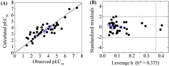 Scatter plot of observed versus calculated pEC50 (A), and the Williams plot of the final model (B) for 50 disinfection byproducts to X-Microtox. “●”: training set, “○”: test set. h*( warning leverage).