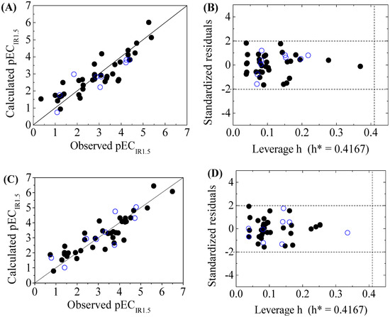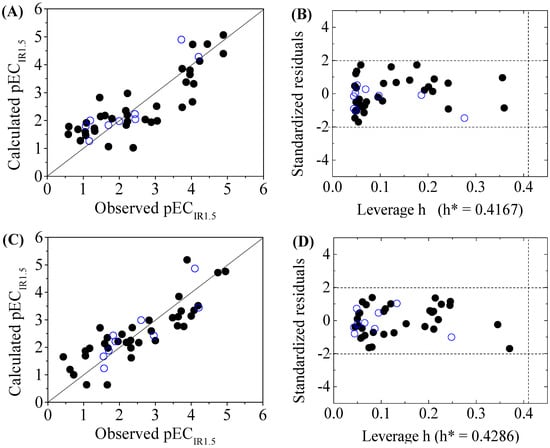 Scatter plot of observed versus calculated pECIR1.5 ((A) for DNA+ and (C) for DNA−) and the Williams plot ((B) for DNA+ and (D) for DNA−) of the final model for 45 disinfection byproducts. “●”: training set, “○”: test set.