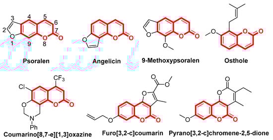 Coumarins widely exist in nature and can be found in all parts of plants, especially in grasses, orchids, citrus fruits, and legumes [4]. Furanocoumarins are one of the main groups in coumarins, based on their chemical structure, they can be generally classified as linear (e.g., Psoralen, Figure 1) and angular (e.g., Angelicin, Figure 1) type. Angular furanocoumarins are always present together with linear furanocoumarins, but in lower contents [5]. As a structural core, furanocoumarins is used regularly as a scaffold in medicinal and agricultural chemistry, this is highlighted by Angelica dahurica and Psoralen (Figure 1), the traditional Chinese herbs, usually possess a broad scope of pharmacological and biochemical activities, including anti-Alzheimer’s disease, anticancer [6], anti-HIV (human immunodeficiency virus), antitumor [7], antitumour, antidiabetic [8], anti-inflammatory, antidepressant [9], antiprotozoal, insecticidal [10], antibacterial [11], and antifungal [12,13] activities, and they are active photosensitizers for the treatment of several skin diseases [14,15,16].