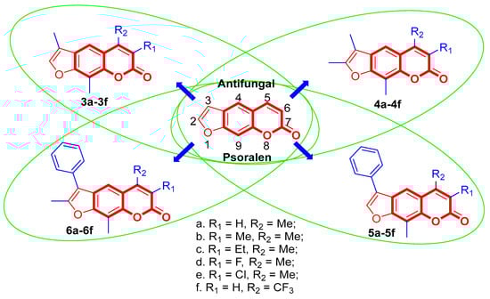 In this study, a series of psoralen derivatives (compounds 3a–3f, 4a–4f, 5a–5f, and 6a–6f) were designed and synthesized by forming a furan ring on the benzene moiety of coumarin. Aiming to improve the levels of antifungal activity, we substituted the hydrogen on C-2 and C-3 positions for methyl or phenyl to block the double bond on furan moiety. In addition, to enrich the compound group, the hydrogen on C-5 and C-6 positions were substituted by methyl, ethyl, trifluoromethyl, fluorine, chlorine, or formed with an additional hexatomic ring on the both position.