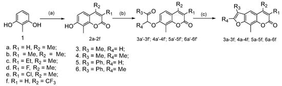 The initial coumarins 2a–2f (Scheme 2) were synthesized from commercially available 2-methylresorcinol and β-ketoester through Pechmann reaction. The mixture of 2-methylresorcinol (100 mmol, 12.41 g) and β-ketoester (ethyl 3-oxobutanoate) (120 mmol, 13.26 g) were dropwise into the concentrated sulfuric acid at iced water with stirring for 12 h, and the crude product was recrystallized to generate compound 2a. Yields for compounds 2a–2f vary from 30% to 60%.