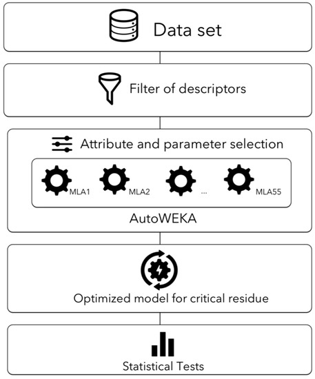 Hence, machine-learning approaches constitute a tool that allow researcher to test both data-driven models and features that best describe observable phenomena. To facilitate the identification of the best model to describe the g(P) function, a combined selection of the largest data set of classification algorithms publicly available and parameter optimization has been implemented in AutoWEKA version 3.8, a suite of machine-learning algorithms coded in Java programming language [20]. This optimization in combination with the list of descriptors available nowadays of protein structure allows for the identification of the best model to classify critical residues for protein function. This effort is relevant considering that machine-learning algorithms have been designed to work with multiple features and the first models aimed to predict critical residues were reported using one or few features derived from protein sequence or protein structure. Yet, a recent report aimed to predict critical residues for protein function based on machine learning approaches [21] used only one algorithm and few descriptors were tested.