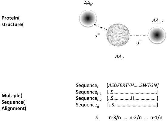 We developed an index to account for the correlated mutations observed in a multiple sequence alignment between residues that in the protein’s three-dimensional structure are in contact. The idea for this index is to account for positions that are relevant for protein structure. To do so, we first computed for every residue within 5 Å apart from each other. Then, for each pair of residues at 5 Å apart in the protein structure we computed the observed normalized frequency of residue substitutions (S); this S for every residue was derived from the multiple sequence alignments reported at the HSSP [40] for two sets of proteins: (i) 150 globular proteins with different folds and PFAM domains [41] and (ii) 588 transmembrane proteins at the TOPDB [42]. This normalized frequency was then used to compute the correlated mutation index (CM) of every j-residue as follows (see Figure 2 and Equation (3)):