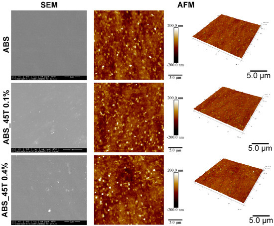 Based on both SEM and AFM images with the same magnification, silver nanoparticles are homogenously distributed in the polymer matrix (Figure 1). The SEM analysis conducted using BSE detector confirmed the increasing content of the silver nanoparticles, depending on the modifier amount. The silver nanoparticles are observed as a light area on SEM images, which was proved by EDX analysis. In the sample containing a higher amount of nonofillers (ABS_45T 0.4%) some small aggregates were present. Such a behavior may result from to the ability of silver nanoparticles to form aggregates. EDX analysis obtained from 10 measurements for each sample showed a homogenous distribution of elements in the whole investigated area (Table 1). The EDX silver content is compatible with the assumed nanosilver content in the materials. AFM images did not show significant differences in the surface morphology. However, Ra and Rq parameters, obtained from AFM images, indicate statistically significant changes with the increasing content of silver nanoadditives.
