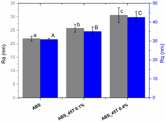 The average roughness (Ra), root mean-square roughness (Rq) of pure polymer and polymer containing 0.1% and 0.4% of silver nanoparticles AgNPs 45T by weight obtained from AFM images. Statistically significant differences (p < 0.05) between the tested materials are marked a–c for Ra and A–C for Rq, respectively.