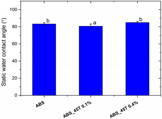 The static water contact angle of pure polymer and polymer containing 0.1% and 0.4% of silver nanoparticles AgNPs 45T by weight. Statistically significant differences (p < 0.05) between the tested materials are marked a–b.