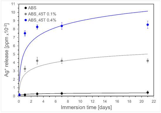The ABS and ABS_45T composites samples were incubated at 37 °C in 50 mL of UHQ water for 21 days. The in vitro release of silver ions was studied by means of Inductively Coupled Plasma Mass Spectrometry (ICP-MS), using an ICP-MS Plasma 6100 spectrometer (Perkin-Elmer, Waltham, MA, USA). In order to protect silver ions (Ag+) from reduction into metallic silver and prior to performing ICP-MS analysis, the filtered samples were acidified with nitric acid, up to the final concentration of 0.1 mol/L. The silver concentrations in the investigated samples were determined using ICP-MS at m/z 107, with the external standard calibration procedure.