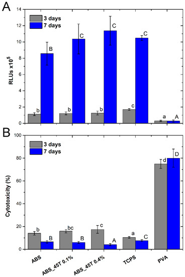 Relative number of cells (A) and cytotoxicity of materials (B) assessed in direct contact with Hs-680.Tr cells. The results are presented as mean values ± standard deviation. Statistically significant differences (p < 0.05) between the tested materials are marked a–c for 3-day culture and A–D for 7-day culture.