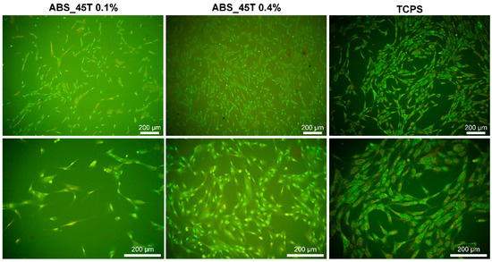 After 7 days of culture, the fibroblasts have a proper shape and they grow evenly on the surface of both materials containing 0.1% and 0.4% AgNPs 45T. Such a conclusion is drawn on the grounds of the fluorescence microscopy images presented in Figure 6. Moreover, it is observed that a much higher number of fibroblasts appears on the material with the higher concentration of silver nanoparticles, which correlates with the results of the cell numbers displayed in Figure 5A. It seems that the cells in contact with ABS_45T 0.4% are better flattened than the ones on the 0.1% AgNPs 45T composite. Such results suggest that the presence of silver nanoparticles in the polymer matrix facilitates the fibroblasts adhesion and proliferation. This phenomenon may result from the increase in the surface roughness for the composites with higher nanoaddition (Figure 2).