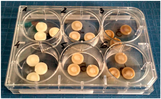 The two types of polymer discs containing AgNPs 45T silver nanoparticles (0.1% and 0.4%) were tested to establish the bactericidal efficacy, using the modified method according to the ASTM E 2180-01 norm (Standard Test Method for Determining the Activity of Incorporated Antimicrobial Agent(s) In Polymeric or Hydrophobic Materials). The only alteration was introduced to match the norm with the size of polymer samples. Every sample was tested according to the following procedure. First, bacterial suspensions were prepared (1.5*10^5 CFU/mL) [CFU − colony forming unit − a measure of viable bacterial cells]: Staphylococcus aureus ATCC 19660 and Pseudomonas aeruginosa PAK [31] Next, 100 mL of 0.3% agar solution and 0.85% NaCl (soft-top agar) solution were prepared for each pathogen and 1 mL of the bacterial suspension was added to soft-top agar solutions respectively. The three samples after manufacturing and after 7-day incubation in DMEM (ATCC, Manassas, VA, USA) containing 10%FBS (HyClone, Logan, UT, USA) were placed in 6-well cell culture plates (wells of 3.5 cm-diameter). One type of bacteria was applied into one well. The samples did not come in any physical contact in the course of the experiment (Figure 8). 50 μL of soft-top agar bacterial suspension was placed on the samples that were incubated at 37 °C for 24 h. After 24 h the polymer samples were transferred to 5 mL-test tubes containing 2 mL of Brain Heart Infusion (BHI) broth. The test tubes were treated with ultrasound for 1 min at room temperature and vortexed (1 min) to transfer bacteria to the broth. At the next stage 400 μL of the BHI-bacteria suspension was mixed with 600 μL of straight BHI. Subsequently, 100 μL was planted on the BHI-soft-top agar composition and incubated at 37 °C for 24 h. After the incubation the bacteria colonies were counted.