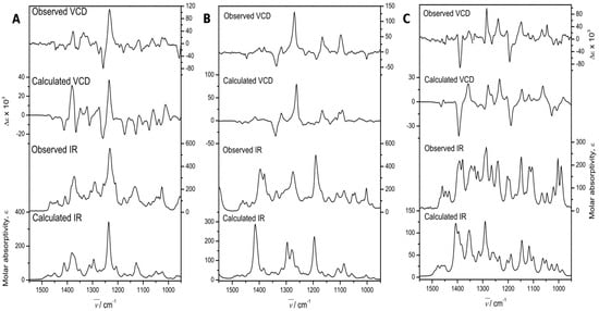 The experimental section details the calculation procedures performed to obtain the theoretical IR and VCD spectra, while the left portion of Figure 5 shows a comparison of the experimental and calculated spectra of 3. These allowed us to determine the absolute configuration. The comparison parameters, determined using the CompareVOA software [38], are given in Table 3, where it can be observed that the determination was accomplished with 100% confidence. The thermochemical parameters associated with the VCD calculations of the conformers contributing to this determination are summarized in Table 4.