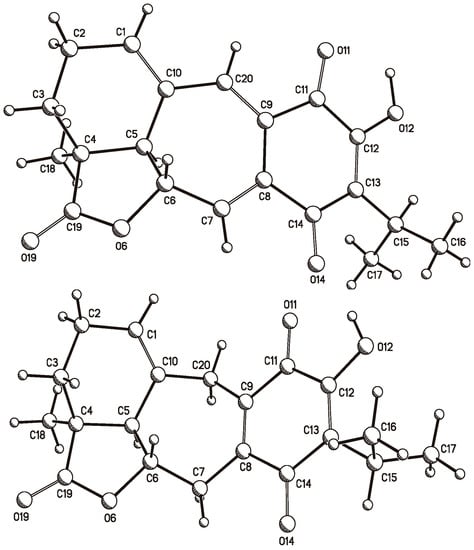 Anastomosine (6), an icetexane diterpenoid isolated from S. anastomosans [27], is also known from S. candicans [28] and from a population of S. ballotiflora collected from a different geographical region of Mexico [23]. Analysis of the 1H, 13C, HSQC, HMBC, and NOESY NMR spectra measured for the present work led to the complete and unambiguous assignment of all hydrogen and carbon atoms. Several discrepancies with the previous 13C-NMR data were found, and therefore all data are included in the experimental section. Through our research, crystals suitable for X-ray diffraction analysis were obtained, and therefore in the first instance, the structure was verified by this independent methodology, which also allowed us to determine the molecular absolute configuration.