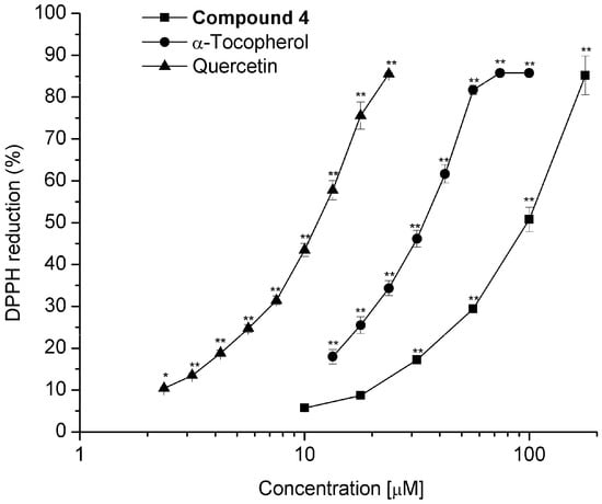 Dose-response curve for determining the IC50 value for scavenging activity on free radical 2,2-diphenil-1-picrylhydrazyl (DPPH) of compound 4 compared with standards α-tocopherol and quercetin. Values represent the mean of at least three independent experiments ± SEM, * p ≤ 0.05, ** p ≤ 0.01 indicate significant differences when compared with the control group (two-way ANOVA followed by the Dunnett post-test).