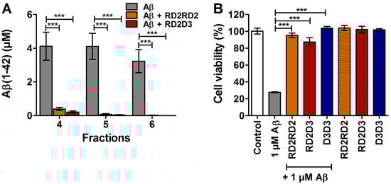 RD2RD2 and RD2D3 eliminated toxic amyloid β protein (Aβ) oligomers and reduced Aβ induced cell toxicity. Potency of RD2RD2 and RD2D3 to reduce toxic Aβ oligomers was demonstrated in vitro by the QIAD assay (A). Both compounds were able to reduce the toxic Aβ oligomers present in fractions 4–6. Cell viability was assessed by MTT (3-(4,5-dimethylthiazol-2-yl)-2,5-diphenyl-tetrazolium bromide) after incubation of PC-12 cells (B) with 1 µM Aβ(1–42) co-incubated with 1 µM RD2RD2 (orange), 1 µM RD2D3 (red), or 1 µM D3D3 (blue). All compounds significantly increase the cell viability after co-incubation with Aβ(1–42), without having negative impact on cell viability when incubated alone (patterned bars). Data is represented as mean ± SD (standard deviation), one-way ANOVA (analysis of variance) with Fisher post hoc analysis, *** p ≤ 0.001.