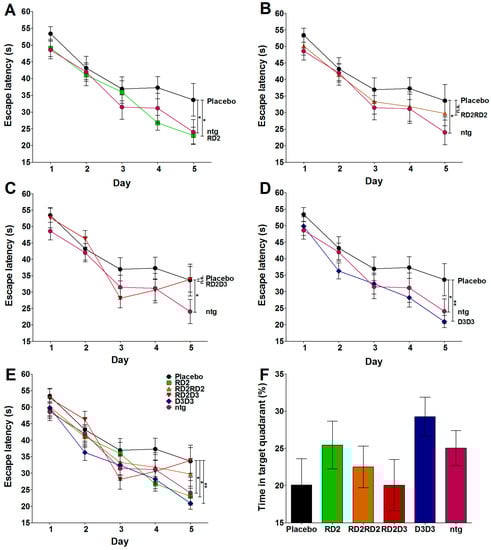 Treatment with RD2 and D3D3 improved cognitive performance as shown in the Morris water maze (MWM). During the acquisition phase of the MWM, RD2- (green, (A,E)) and D3D3- (blue, (D,E)) treated mice showed significantly improved learning behaviors compared to those of placebo- (black) treated mice (two-way repeated measurements (RM) ANOVA, Fisher post hoc analysis, * p < 0.05, ** p < 0.001) (A–C,E). The improved cognitive performance is indistinguishable to that of non-transgenic littermates (ntg, pink) ((A–C)). Neither RD2RD2- (orange (B,E)) nor RD2D3- (red, (C,E)) treated mice showed improved cognitive performance compared to the behavior of placebo-treated mice. (E) is a combination of (A) to (D) for direct comparison of all four tested compounds. The probe trial did not reveal significant differences between the groups, but showed the tendency of RD2- and D3D3-treated mice to spend more time in the target quadrant F.