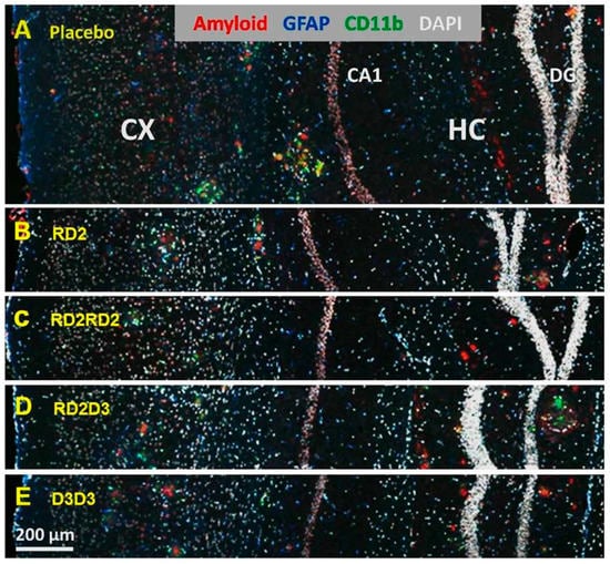 By analysis of two populations of glia cells—glial fibrillary acidic protein (GFAP)-expressing astrocytes and CD11b-expressing reactive microglia—no significant effect of RD2, RD2RD2, RD2D3, or D3D3 treatment was achieved compared to placebo-treated mice, suggesting that there is no change within the neuroinflammatory status of the treated mice (Figure 3A–E).