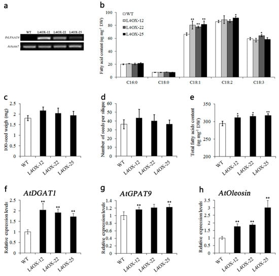 2.6. Overexpression of PrLPAAT4 in Arabidopsis Increases FA Content and Expression of FA and Lipid Biosynthetic Genes
