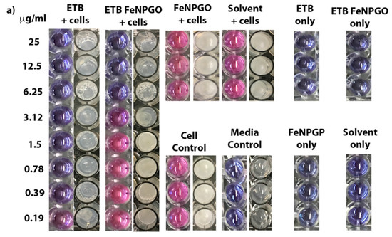 ETB-FeNPs-GO was found to inhibit the formation of a continuous biofilm at the air-liquid interface at the MIC for planktonic cells (effective concentration 2.1 µg/mL). Complete inhibition of all cell growth is seen at a concentration that is two-fold higher than the MIC (effective concentration 2.1 µg/mL). ETB alone inhibits biofilm formation in M. smegmatis at its MIC of 0.39 µg/mL, apparently, resulting in better inhibition in vitro than the nanoformulation (shown in Figure 2b,c) reasonably, due to the sustained release of the drug.