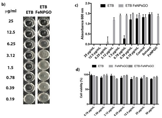 In vitro cytoxicity profile of free drug ETB, nanocarrier FeNPs-GO, and multifunctional nanoformulation (ETB-FeNPs-GO) was evaluated on eukaryotic 3T3 cells using a range of concentrations (i.e., 0.78–50 ug/mL) of all the samples. Untreated cells were taken as standard. Cells were incubated with the samples for 72 h and cell viability was determined using MTT assay. All of the samples were found to be highly biocompatible as the cell viability was found to be more than 80% after 72 h treatment period as shown in Figure 2d.