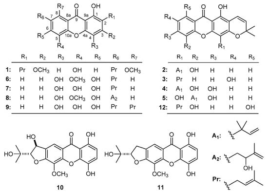 - Oger, J.M.; Morel, C.; Helesbeux, J.J.; Litaudon, M.; Seraphin, D.; Dartiguelongue, C.; Larcher, G.; Richomme, P.; Duval, O. First 2-hydroxy-3-methylbut-3-enyl substituted xanthones isolated from plants: Structure elucidation, synthesis and antifungal activity. Nat. Prod. Res. 2003, 17, 195–199. [Google Scholar] [CrossRef] [PubMed]