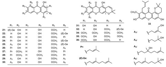 Cylindroxanthones A–C (34, 35 and 36) (Figure 3) were gained from G. cylindrocarpa [], along with the increase of methoxy, the anti-proliferative potency against oral epidermoid KB cell line (IC50: 2.36, 59.05 and 57.24 μM for 34, 35 and 36 respectively) increased. The results indicated that the oxidation of the unsaturated isoprenyl group reduced anti-proliferative activity.