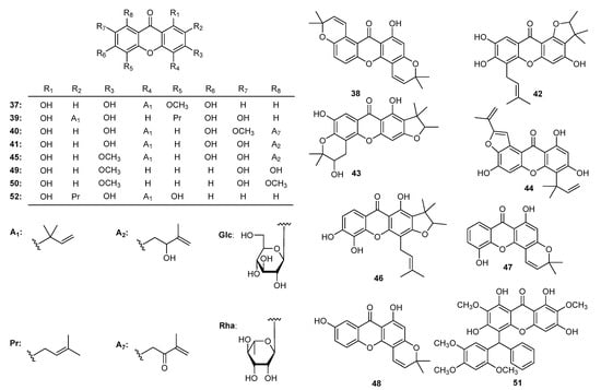 Neuroblastoma (SHSY5Y) cell line proliferation could be inhibited by neriifolone A (37), cudraxanthones A (38), L (39), cudratrixanthones C (40), G (41), H (42), I (43), O (44), 3-O-methyl-cudratrixanthone G (45), gerontoxanthone C (46), 6-deoxyisojacareubin (47), and nigrolineaxanthone F (48) (Figure 4) []. Moreover, gentiakochianin (49) and gentiacaulein (50) from G. kochiana [] were also proved to promote cell cycle arrest in G2/M and G0/G1 phases in U251 human glioma cell line. Muchimangin B (51) [] and allanxanthone A (52) (Figure 4) [] inhibited the growth of pancreatic cancer (PANC-1), multiple myeloma (RPMI8226) and gastric cancer (BGC-823) cell lines. The SARs of above xanthones were not discussed for limitation on test sample number.