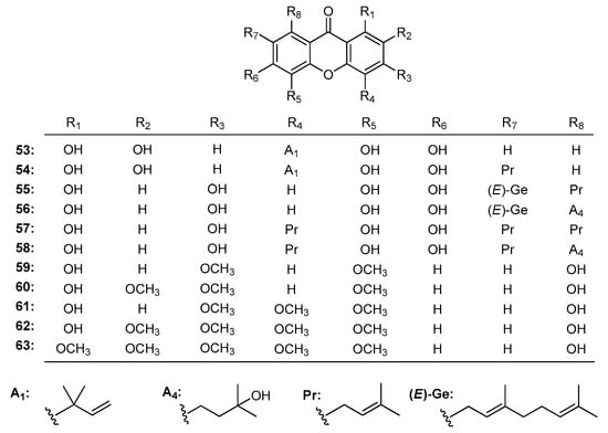Symphoxanthone (53), subeliptenone B (54), garciniaxanthone E (55), garcinenone D (56), 1,3,5,6-tetrahydroxy-4,7,8-tri(3-methyl-2-butenyl)xanthone (57), garcinenone E (58) (Figure 5) were isolated from G. xanthochymus []. Their IC50 values against 1,1-diphenyl-2-picrylhydrazyl (DPPH) radical were 6.4, 6.0, 10.1, 6.8, 10.1, 8.5 μM, respectively. SARs analysis indicated that the radical-scavenging activity was partly related to phenolic hydroxy moiety numbers. Within them, compounds with ortho diphenolic hydroxy groups showed significant radical-scavenging activity.