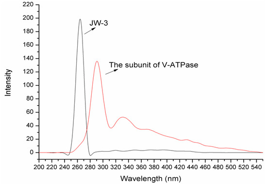 The synchronous fluorescence spectra of of both JW-3 and the H subunit of V-ATPase at a constant offset value Δλ = 15 nm.