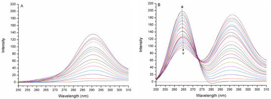 The fluorescence quenching spectra of JW-3 by the subunit H of V-ATPase at 298 K and pH 6.8. (A) In the absence of JW-3; (B) In the constant concentration of JW-3 (6.578 × 10−5 M). The concentration of the protein changed from a to v (10−7 M): 0, 0.67, 2.00, 3.32, 4.62, 5.90, 7.17, 8.42, 9.66, 10.88, 12.08, 13.27, 14.45, 15.61, 16.75, 17.89, 19.00, 20.11, 21.20, 22.29, 23.35, 24.41.