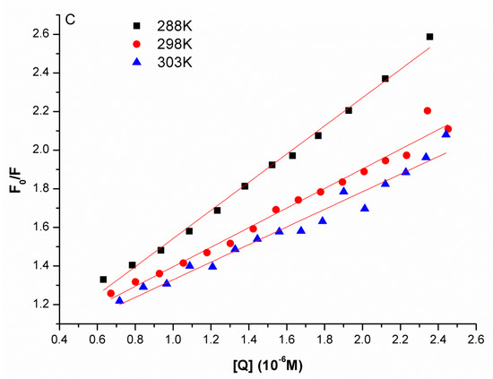 where F0 and F are the steady-state fluorescence intensities in the absence and presence of a quencher, respectively; [Q] is the concentration of the quencher; Ksv is the Stern-Volmer dynamic quenching rate constant. Based on the linear fit plot of F0/F versus [Q], the Ksv values and Stern-Volmer curves of JW-3—the subunit H system could be obtained.