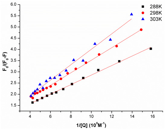 where, for our study, F0 and F are the fluorescence intensity in the absence and presence of the quencher, respectively; Ka is the effective quenching constant for the accessible fluorophores, which is analogous to the association binding constants (Ka) for the quencher-acceptor system; [Q] is the concentration of the quencher; and fa is the fraction of accessible fluorescence. As shown in Figure 5, the curves of F0/(F0 − F) versus [Q]−1 were linear when calculated according to quencher concentrations. The corresponding parameters are presented in Table 2. Moreover, the decreasing trend of Ka indicated that the binding of JW-3 to the V-ATPase subunit H was reduced as the temperature increased.
