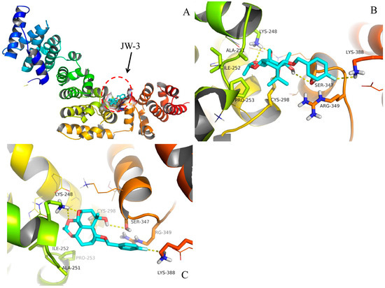 In order to understand the interaction of JW-3 with the H subunit of V-ATPase, docking simulations of the interaction between the inhibitor and the protein carried out. Docking protocol was followed with the model structure. Taking into account the high binding energy and the reasonable binding conformation, the representative configuration in the highest populated cluster with the lowest-energy was thereafter selected. As shown in Figure 7, compound JW-3 could well bind in ‘the interdomain cleft’ of the M. separata V-ATPase subunit H with the binding energy predicted to be −6.07 kcal/mol. The five hydrogen bonds of the hydroxyl oxygen atom with the side chain of Ser-347, the fluorine atom with the side chain of Lys-388, the three oxygen atoms on the rings with the side chain of Lys-248 and Cys-298 were reproduced (Figure 7B,C). Interestingly, the p-fluorobenzyl group extended into the space between the side chains of Arg-349 and Lys-388, which suggested a special electrostatic interaction. It is believed that these polar contacts were the major contributors to the stabilization of the ligand binding.