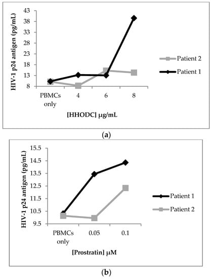 Ethical approval for obtaining blood samples from consenting donors was granted by the Faculties of Natural and Agricultural Sciences, and Health Sciences Ethics Committees (EC080506-019;163/2008, University of Pretoria, South Africa). Fresh whole blood from two infected patients on cART was treated to density centrifugation on a Ficoll–Hypaque (Sigma, St. Louis, MO, USA) gradient to obtain peripheral blood mononuclear cells (PBMCs). PBMCs were seeded at 5 × 105 per well in a 24-well format and treated with HHODC (4, 6 and 8 µg/mL) and prostratin (0.05 and 0.1 µM). Supernatant was drawn after 72 h and analysed for p24 concentration using a RETRO-TEK HIV-1 p24 antigen ELISA kit (ZeptoMetrix Corporation, Buffalo, NY, USA). The viability of treated cells was evaluated by adding MTT after the removal of supernatant.
