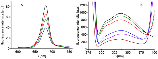 Fluorescence emission spectra of chlorophyll a in untreated spinach chloroplasts in presence of compound 23 (R = 5-Br-2-Cl; c = 0, 56, 220, and 431 μM; curves from top to bottom); excitation wave length λex = 436 nm, chlorophyll concentration 10 mg/L (A) and fluorescence emission spectra of aromatic amino acids in suspension of spinach chloroplasts without and with compound 23 (c = 0, 5.9, 11.8, 23.6, 29.5 and 47.2 μM; curves from top to bottom); excitation wave length λ = 275 nm, chlorophyll concentration 10 mg/L (B).