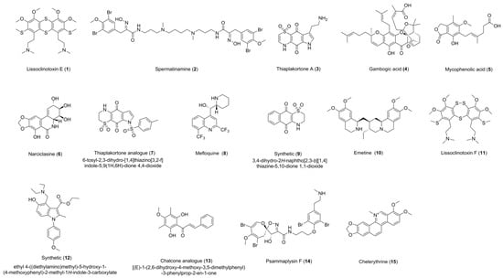 The Davis open access natural product-based library currently consists of 472 distinct compounds, the majority (53%) of which are natural products that have been obtained from Australian natural sources, such as endophytic fungi [], plants [], macrofungi [], and marine invertebrates []. Approximately 28% of this library contains semi-synthetic natural product analogues [], while a smaller percentage (19%) are known commercial drugs or synthetic compounds inspired by natural products.