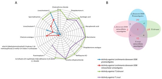 (A) Spider plot displaying the IC50 values of compounds for L. donovani DD8 promastigotes, L. donovani DD8 intracellular amastigotes, T. b. brucei and T. cruzi; (B) Venn diagram for overlapping active hits identified against L. donovani DD8 promastigotes, L. donovani DD8 intracellular amastigotes, T. b. brucei and T. cruzi.