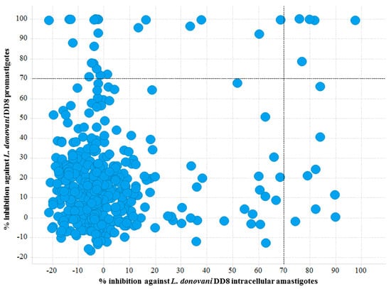 Scatter plot of active hits against L. donovani DD8 promastigotes and L. donovani DD8 intracellular amastigotes. Right top quadrant exhibiting compounds found to be active on both L. donovani DD8 promastigotes and L. donovani DD8 intracellular amastigotes.