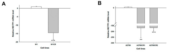 Expression analysis quantitative polymerase chain reaction (Q-PCR) of the MCTP1 gene in: W1 (A); and A2780 (B) CIS-resistant cell sublines. Expression analysis of the MCTP1 gene in: W1 (C); and A2780 (D) TOP-resistant sublines. The figure presents the relative gene expression in resistant cell lines (grey bars) with respect to the sensitive cell line (white bars), assigned as 1. The values were considered significant at ** p < 0.01 and *** p < 0.001.