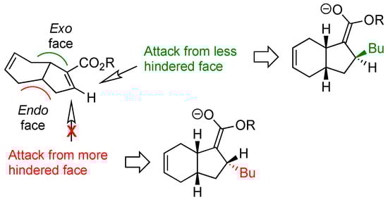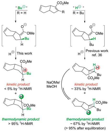 Albeit that the outlined synthesis did not yield the ultimate target, the sequence provided an answer to a central question: namely, the question about the geometry of the fused bicycle. Moreover, taken together with what we have detailed before [], the current findings have demonstrated a fascinating chemical aspect of the cis-fused bicyclo[4.3.0]non-3-ene scaffold, that unfolds when a Michael acceptor motif is incorporated. Thus, swapping the functional group at the β-position of the Michael acceptor with the functional group of the Michael donor, a complete inversion of diastereoselectivity was observed. The transformation proved to be doubly orthogonal, as even the stereochemistry at the α-position was inverted in the process. Bearing in mind the chosen protocol, it must be assumed that the favoured epimer is not obtained via spontaneous equilibration of the incipient ester enolate anion. Rather, the reactive constellation between BuMgCl and TMSCl intercepts the Michael adduct as a silyl ketene acetal; it is therefore in the succeeding protonation of the trapped ester enolate anion that the observed epimeric configuration is established (Scheme 4). The stereoselective protonation of enolates is a concept, which has received a great deal of attention and in its purest form constitutes a biomimetic approach to establish α-chirality [,,,]. In our example, the pre-existing topology works in consonance to dictate which face is being protonated.