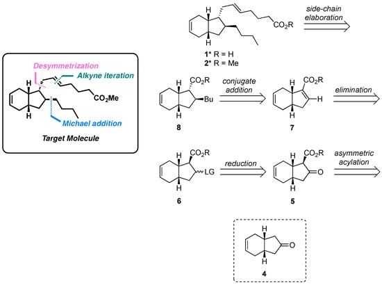 Fascinated by the structure and the prostane-like motif, we devised a practical, divergent and synthetically unambiguous strategy to establish the proposed stereochemistry. At the end of the campaign, capitalizing on X-ray crystallography to pinpoint the relative arrangement, it was concluded that mucosin (1) does not represent the portrayed compound []. In a pursuit to identify the natural product isolated from Reniera mucosa, our intent is to achieve the goal by manipulation of the bicyclo[4.3.0]non-3-ene system. We herein detail synthesis of the mucosin diastereomer 1*, demonstrating aspects of the chosen route with regard to stereochemical control (Figure 2). From the point of potential biological activity, the putative structure of mucosin shares some apparent structural similarities with bicyclic prostaglandins. Thus, providing that sufficient amounts could be made available, material could be screened in similar assays. Currently, it is the bearer of unknown properties.