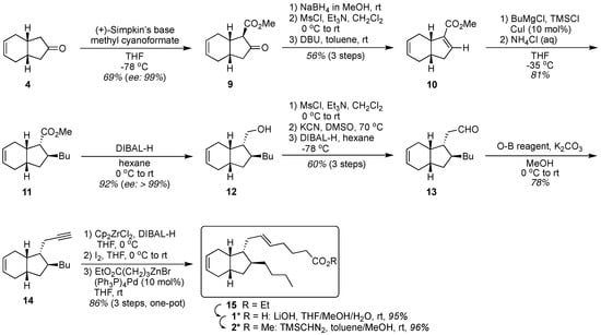 By achieving a rational synthesis of exo-mucosin 2*, the target selection has been narrowed down. Yet, in terms of the cis-fused bicycle, there are permutants still unaccounted for. However, given the obvious sterical encumbrance of the two remaining syn-diastereomers, they seemed unlikely candidates considering the biogenesis of marine carbocyclic oxylipins [,,]. Additionally, it is worth noticing that the anti-relationship of the appended groups seems to rest on a sounder foundation: Diagnostic correlations between the C7-methylene group and the C16-proton have been observed by NOESY and ROESY []. Furthermore, DFT calculations by Whitby and co-workers on the relative stability of zirconacycles [], indicate that the anti-geometries are favoured over the syn-geometries. Hence, based on our synthetic endeavours, it was inferred that the natural product named mucosin has a trans-fused bicyclo[4.3.0]non-3-ene ring system and the featured substituents are anti-related.