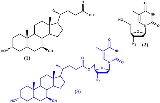 Chemical structures of ursodeoxycholic acid (UDCA) (1), azidothymidine (AZT) (2), and the prodrug (AZT-UDCA) (3).