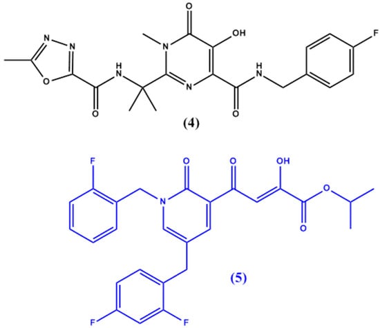 HIV-1 integrase, an enzyme required for HIV replication, is another target for anti-HIV agents. While raltegravir (4 in Figure 2) is the only compound discovered to work on the HIV integrase enzyme, Seo et al. [14] have synthesized a lead compound, (4-(1.5-dibenzyl-1,2-dihydro-2-oxo-pyridin-3-yl)-2-hydroxy-4-oxobut-2-enoic acid), which was used in the design of potent HIV integrase inhibitors with favourable pharmacokinetic and pharmacodynamic profiles (in vitro half-life of >3 h post incubation in liver microsomes). The original lead compound suffered from poor cellular permeability which was improved by the synthesis of a novel isopropyl ester prodrug of a similar derivative (5 in Figure 2).